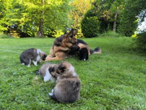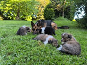 Atari ist unser kleiner „Bürgermeister“, selbstbewusst und charmant, auch bei den Schäferhund-Tanten kann er sich behaupten. Er ist tiefenentspannt, lässt sich gerne tragen und auch beim Krallenschneiden bleibt er ruhig. Er ist ein lustiger Welpe, der manchmal etwas gebremst werden muss. Die Geschwister sorgen aber für Ausgleich im Wurf. Bei Geräuschen zeigt er Interesse und muss dann alles gleich inspizieren. - Lebenswoche: