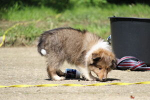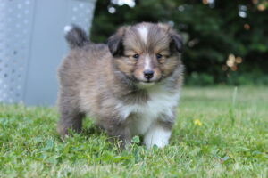 Beim Welpentest fiel er besonders durch seinen Mut und seine verspielte Art auf. Er erkundet neugierig seine Umgebung und testet dabei immer wieder seine Grenzen, das zeigt er auch im Umgang mit seinen Artgenossen. Besonders auffällig ist sein großes Interesse am Menschen. Insgesamt zeigt er sich als lebhafter und fröhlicher kleiner Rüde mit einer frechen Note. - Lebenswoche: