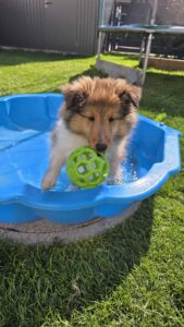 Atari überragt alle anderen aus dem Wurf deutlich (3,23 kg in Woche 9). Sein Verlauf orientiert sich an kräftigen, größeren Sheltie-Rüden und im Bereich des Vaters oder darüber, also eine imposante, maskuline Erscheinung.